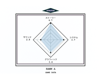 <div class="xr-radar" data-values="4.7,3.7,3.6,2.8" data-labels="ストーリー,システム,グラフィック,サウンド" data-max="5" data-title="STATUS" data-type="GAME DATA" data-rank="on"></div>
